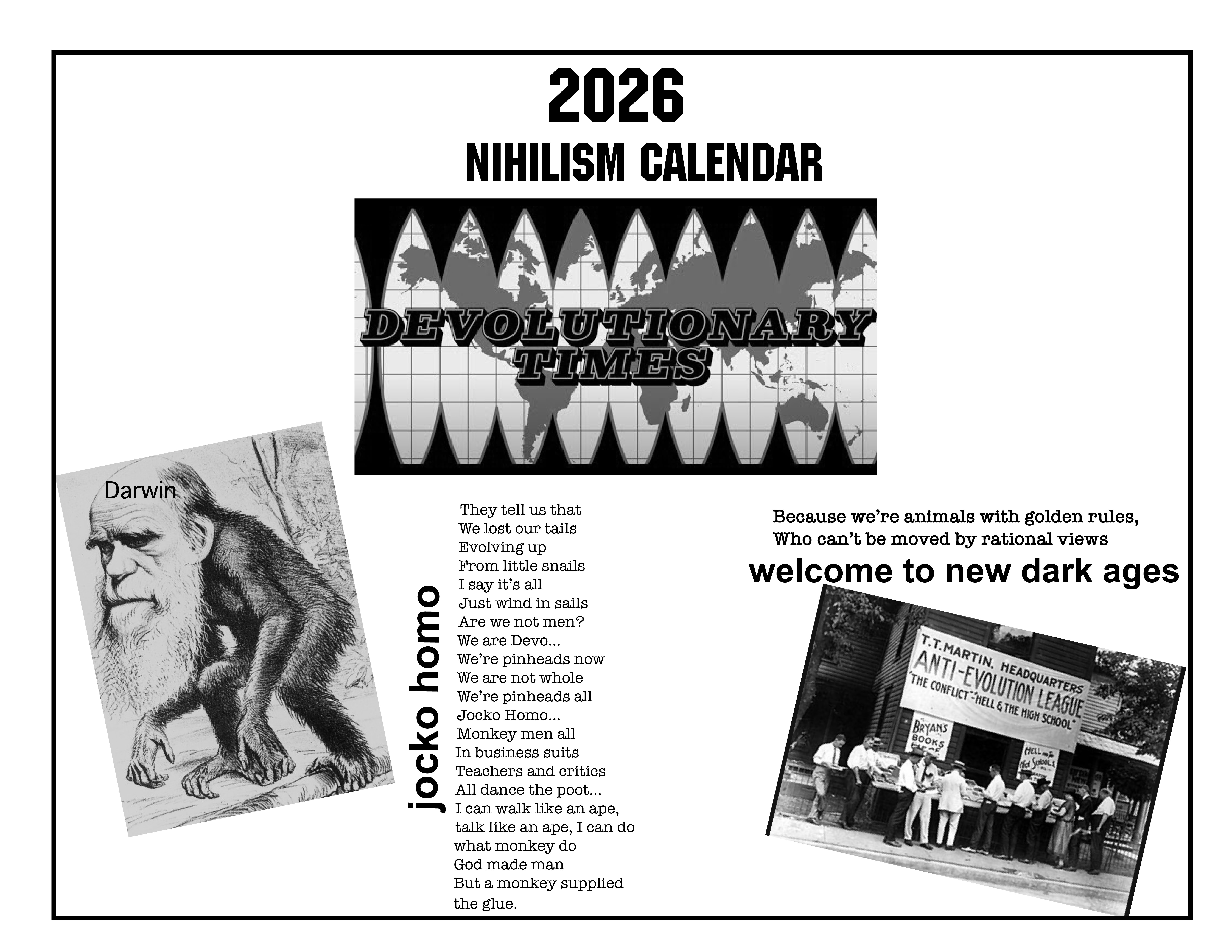 Looking for that perfect Christmas gift for your nihilist friends? You’re in luck. The new 2026 Nihilism Calendar is out now. Featured in the all new 2026 Nihilism Calendar are all the gruesome, violent and just plain funny events that shock us every day in the newspaper. The Nihilism Calendar combines irreverent humor, grotesque and curious dates of significance, demented press clippings and peculiar snapshots, all of which celebrate reality as nihilists like to see it.