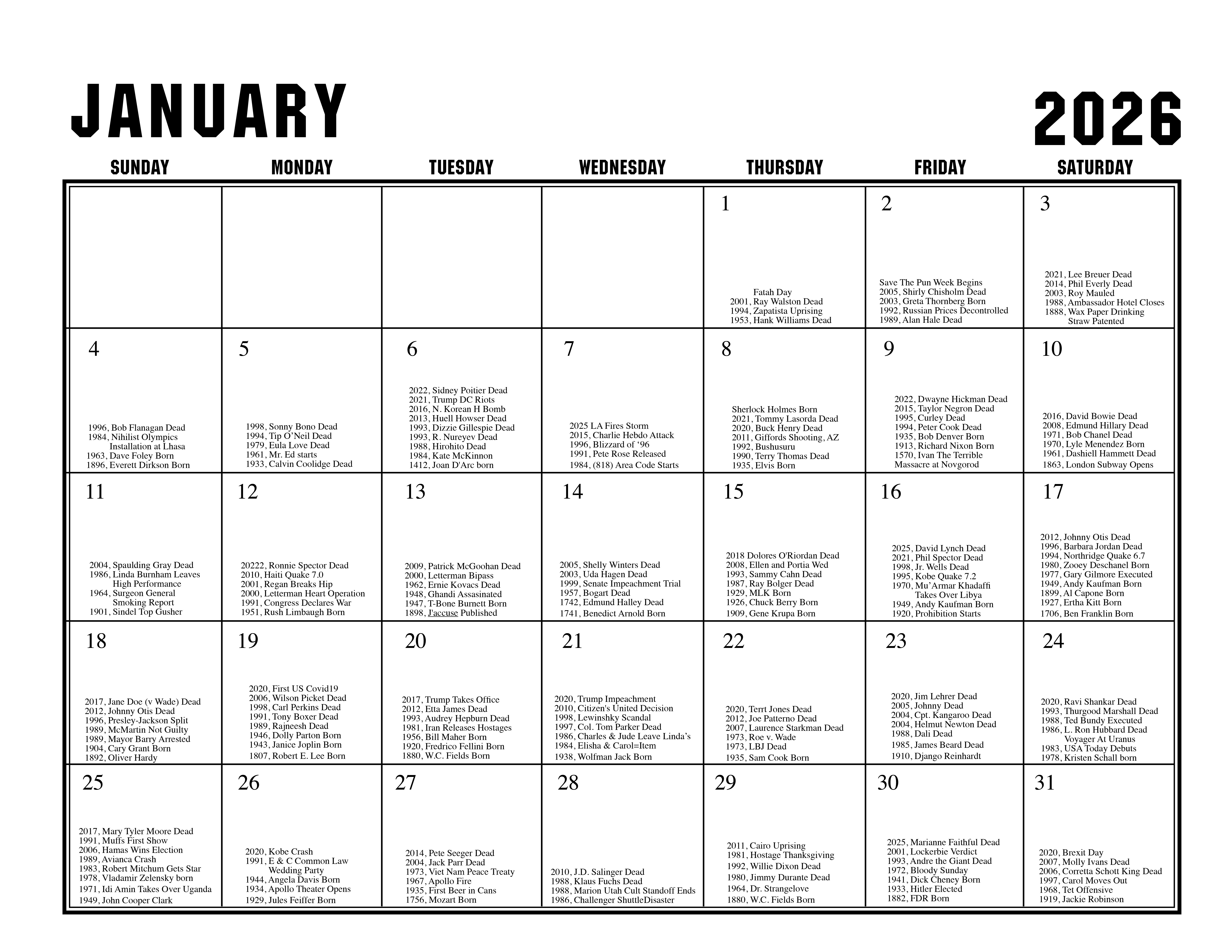 The 2026 Nihilism Calendar includes over a thousand dates of nihilist significance. Here are just a few: